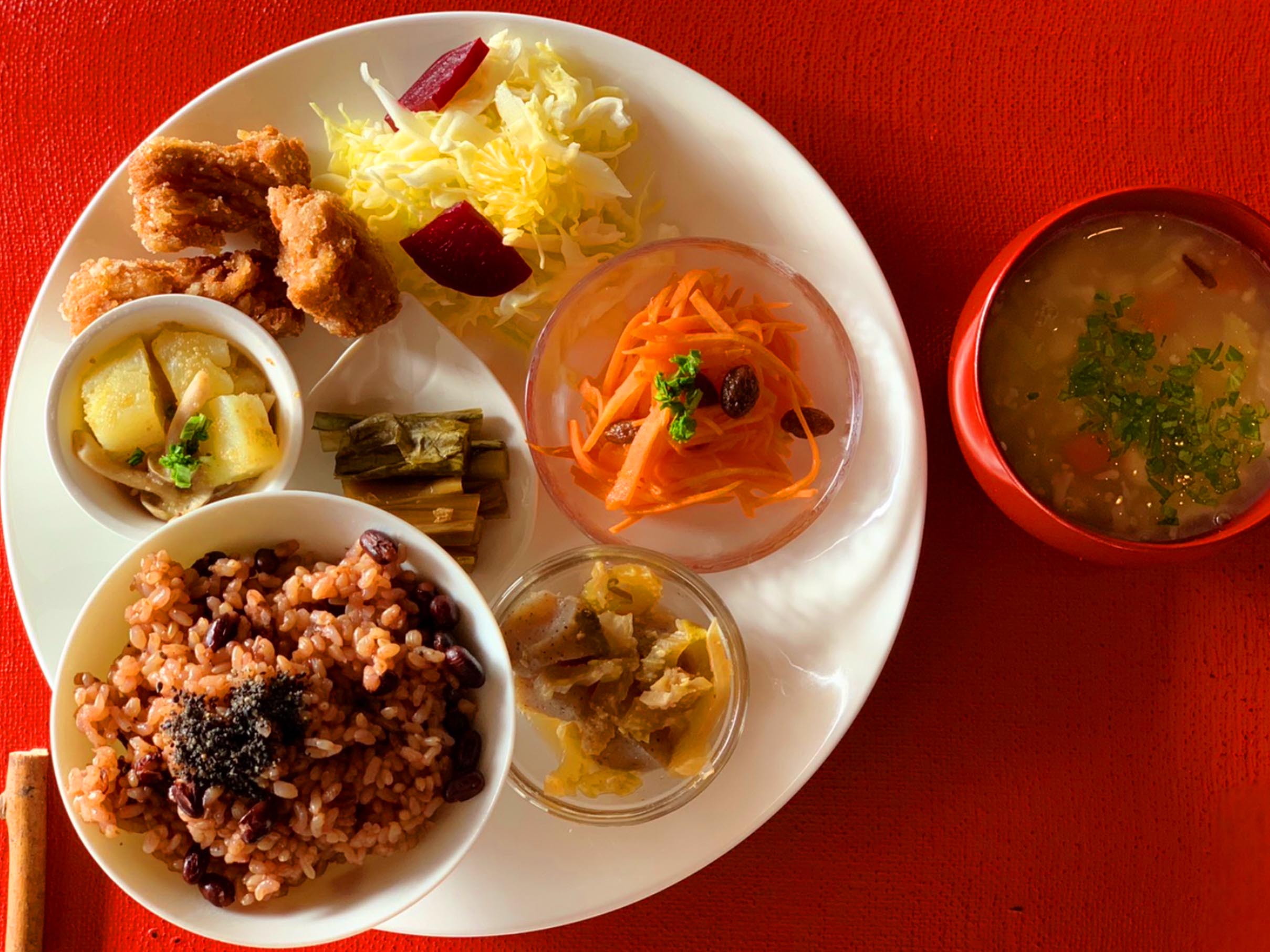 Le propriétaire du restaurant profite de son expérience personnelle avec les allergies alimentaires. Il croit en la préservation du goût original des ingrédients et propose des aliments à base de plantes et des gâteaux au goût doux. Il utilise uniquement du riz sans pesticides, des légumes issus de l’agriculture biologique, de la sauce soja et du miso naturels et de l’huile sans additif.